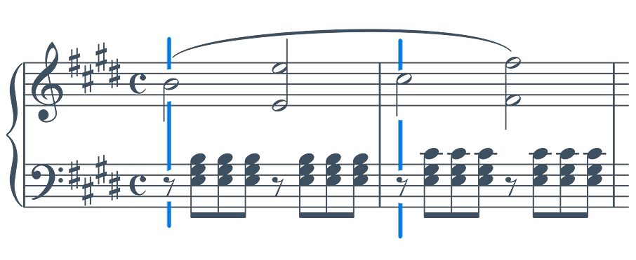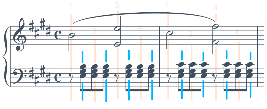Placez les « barres de pulsation » en traçant des lignes qui traversent les deux portées (cette approche semble judicieuse car elle permet de mettre en valeur la coordination entre les mains). L’espace entre deux barres doit impérativement correspondre à 1 « temps ». Le temps qui s’écoule entre les 2 barres de la pulsation est toujours le même.
