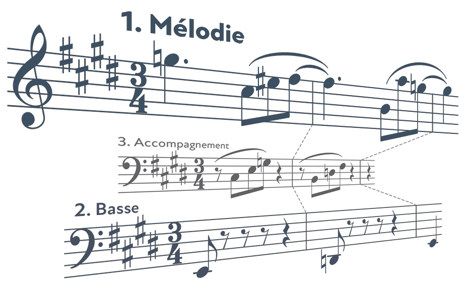 Dans la plupart des pièces, on peut distinguer trois couches (ou plans) sonores : la mélodie, la basse et l'accompagnement, et il est souhaitable d'établir une hiérarchie entre eux. Voici leurs caractéristiques :