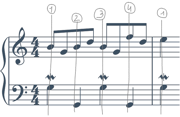 Jouez les deux mains ensemble en « marchant » uniquement les premiers temps de chaque mesure.